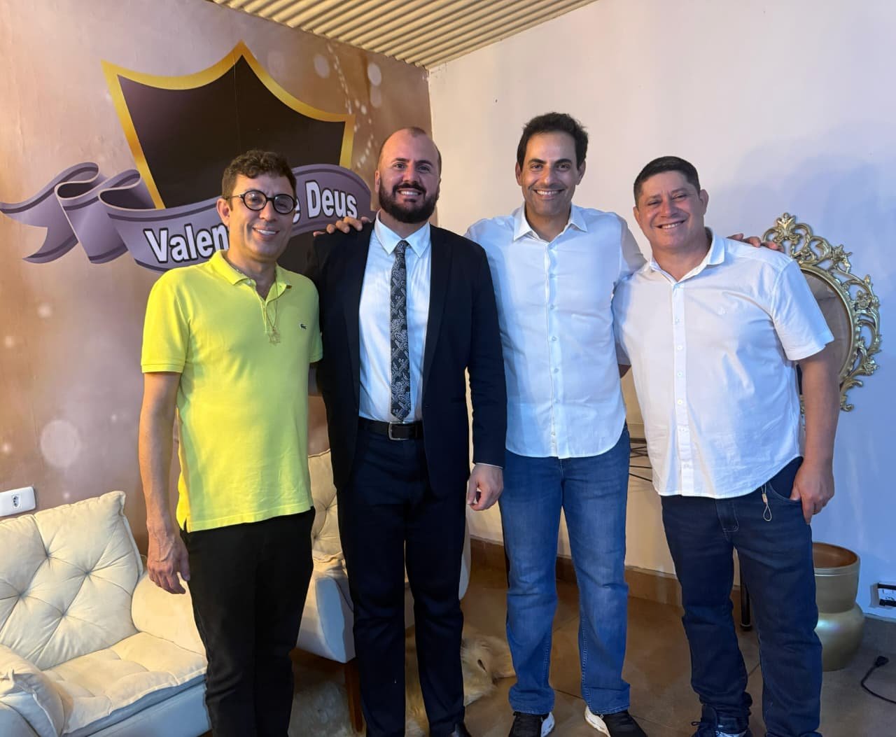 Em um clima de gratidão e fé, o deputado estadual Jamil Calife (PP) participou da celebração dos 10 anos do Ministério Valentes de Deus, em Ipameri, ao lado do pastor Márcio, líder da igreja, do vereador Marcelo Godoy e do empresário Renato Sales.